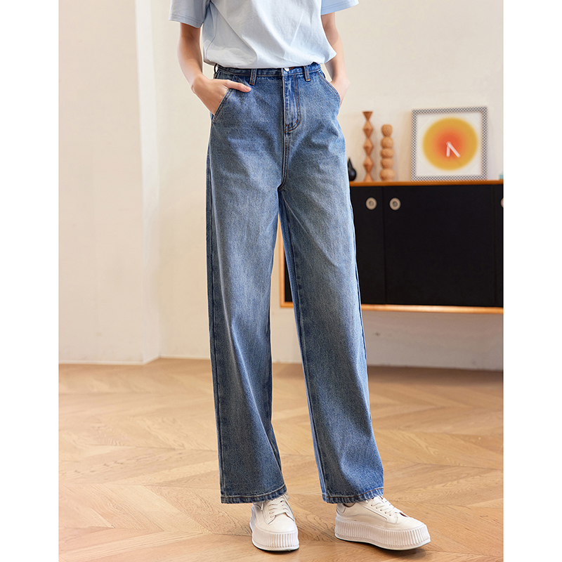 德玛纳蓝色牛仔裤女春季新款高腰垂感直筒阔腿裤宽松法棍裤子