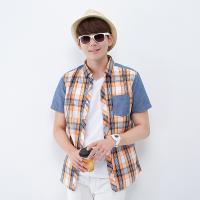 唐狮夏装正品男衬衫 男格子拼接短袖休闲衬衫