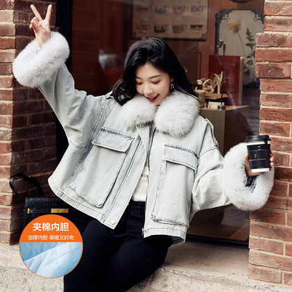 【拼接牛仔棉衣】冬季棉服女毛领高档拼接牛仔夹棉外套