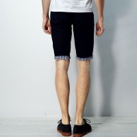 唐狮夏装牛仔裤 男格子布拼接基本款牛仔五...