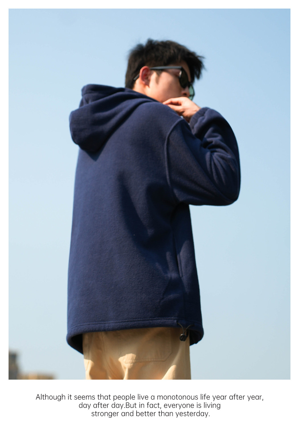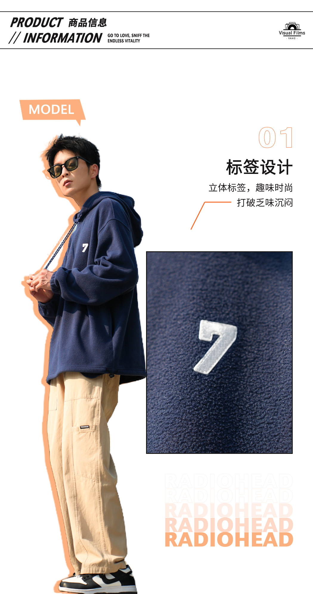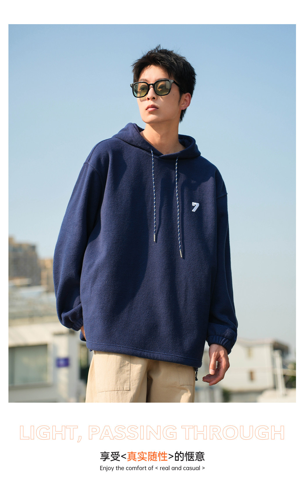 Radiohead2023秋冬新款连帽摇粒绒卫衣男藏青纯色宽松保暖抽绳潮