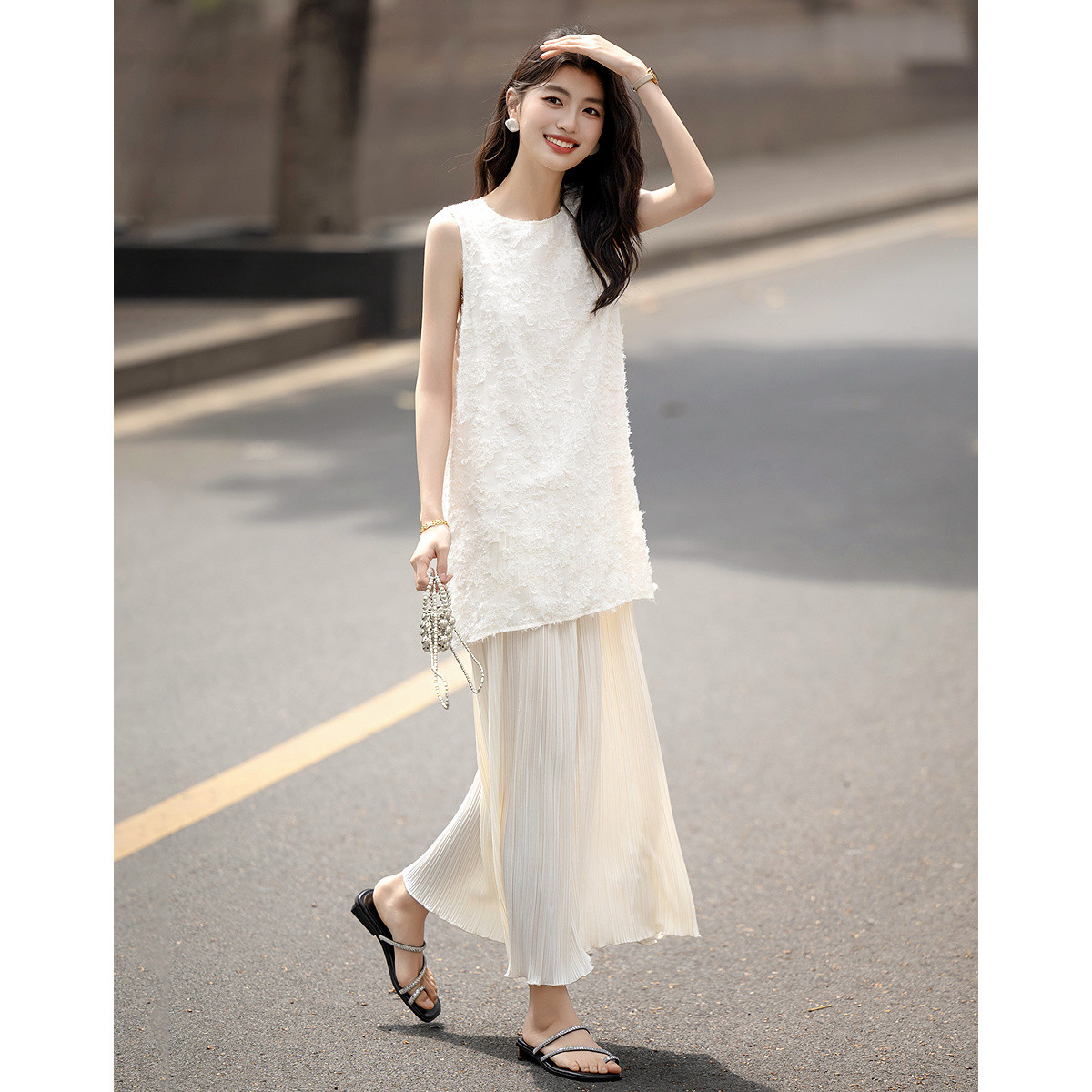 德玛纳【欧若风假两件】轻薄慵懒立体剪花无腰线直筒压褶女式连衣裙G540221558703