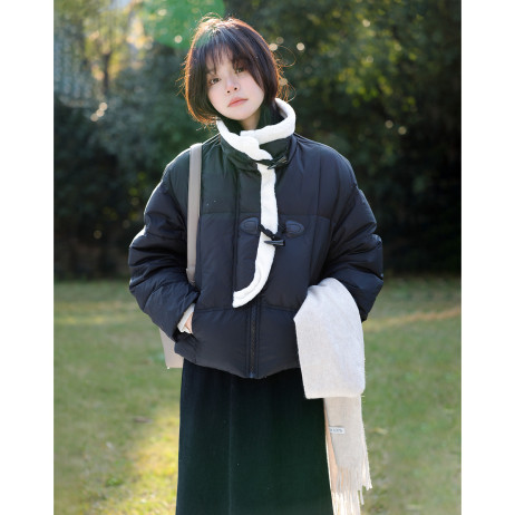 【中式毛料拼接】2024冬季款立领牛角扣时尚新中式百搭羽绒服