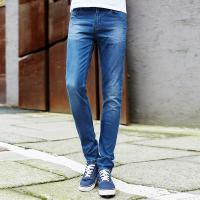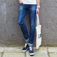 唐狮夏装正品牛仔裤 男弹力中腰拼格子修身小脚牛仔长裤