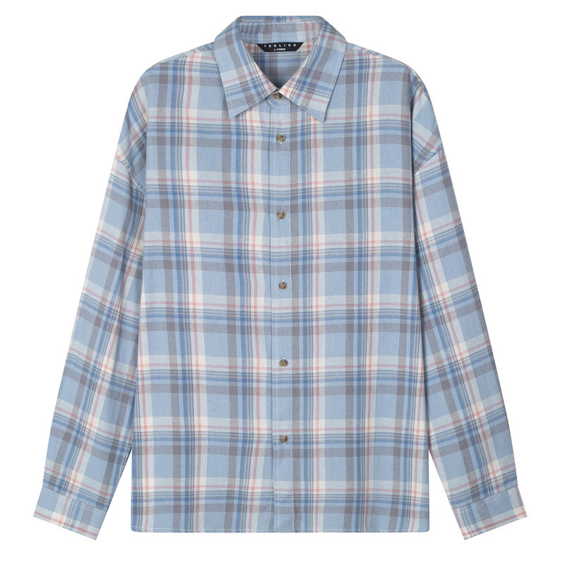 唐狮格子衬衫男长袖秋宽松文艺小清晰格子衫韩版休闲蓝色格子衬衣
