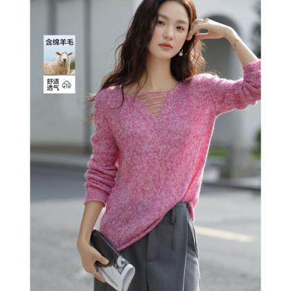 德玛纳【含绒感绵羊毛】秋季设计感V字圆领线衫花纱小个子针织衫女上衣G540320340402