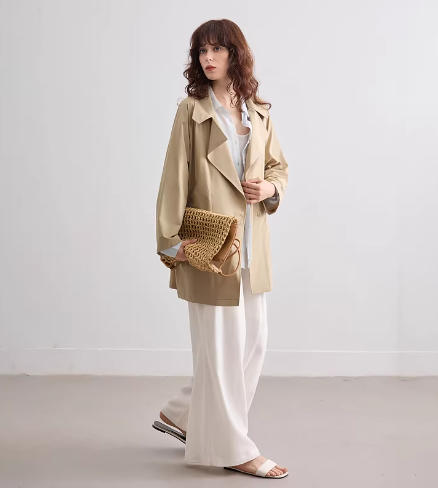 德玛纳【抑菌冰藻泥】春季质感雅丹翻驳领两粒扣宽松小个子女式风衣外套G541120466702